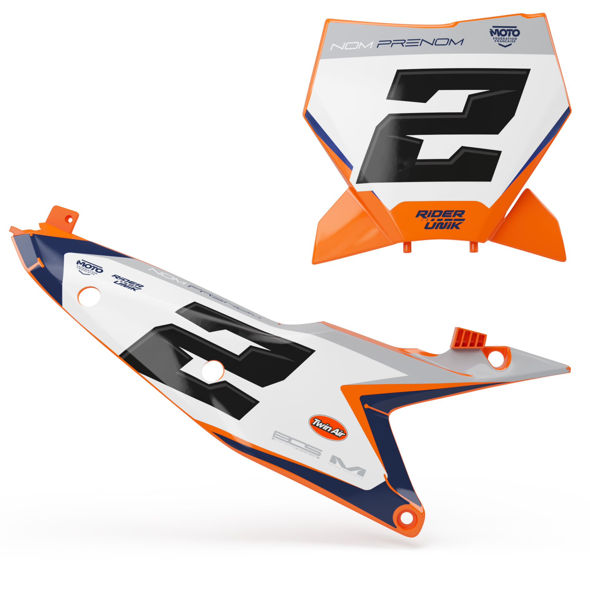 Personnalisez vos plaques numéros grâce au kit déco fonds de plaques RiderUnik. Nos graphistes vous enverront sytématiquement une mlaquette par e-mail après validation et règlement de votre commande. Vos choix:* Option nom numéro sponsors : Ajoutez vos logos, votre nom et numéro à votre déco* Option mat : Vous donne le choix de la finition de votre déco, par défaut celle-ci est brillante* Option grip : Le grip est une matière rugueuse, que nous pouvons mettre sur les boîtes à air. ( option à cocher au préalable )