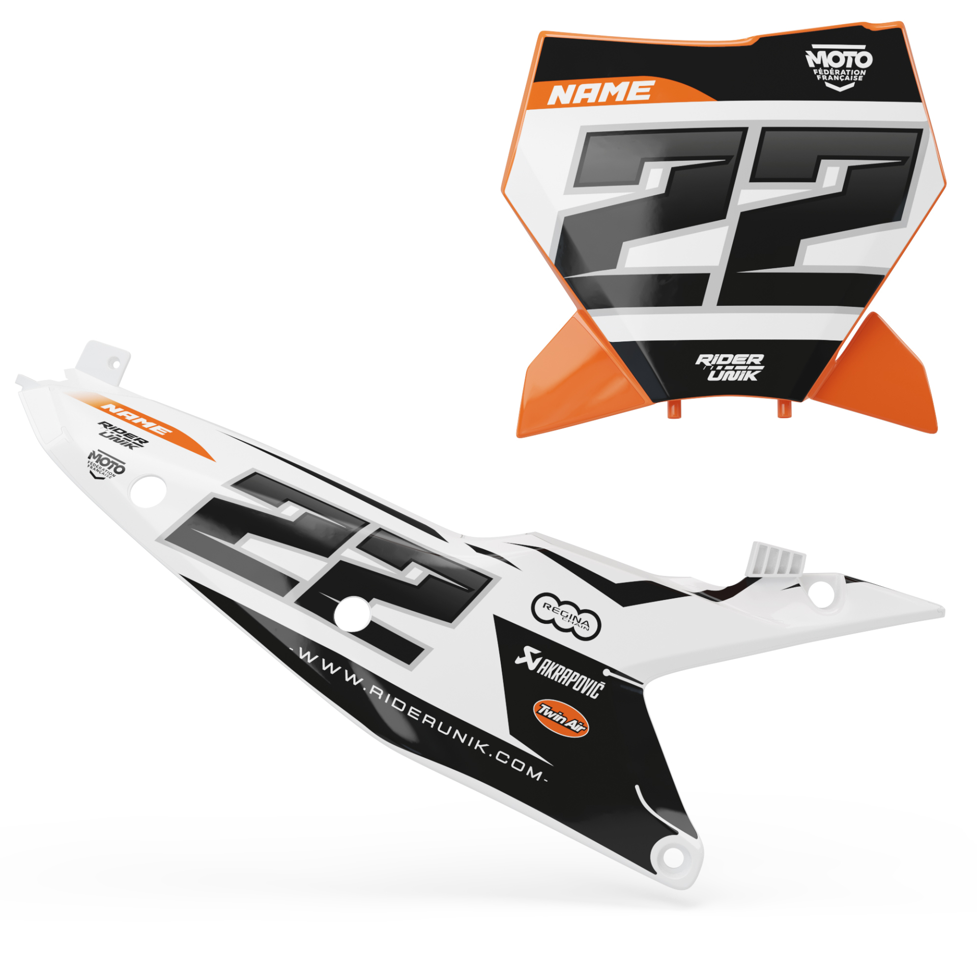 Personnalisez vos plaques numéros grâce au kit déco fonds de plaques RiderUnik. Nos graphistes vous enverront sytématiquement une mlaquette par e-mail après validation et règlement de votre commande. Vos choix:* Option nom numéro sponsors : Ajoutez vos logos, votre nom et numéro à votre déco* Option mat : Vous donne le choix de la finition de votre déco, par défaut celle-ci est brillante* Option grip : Le grip est une matière rugueuse, que nous pouvons mettre sur les boîtes à air. ( option à cocher au préalable )