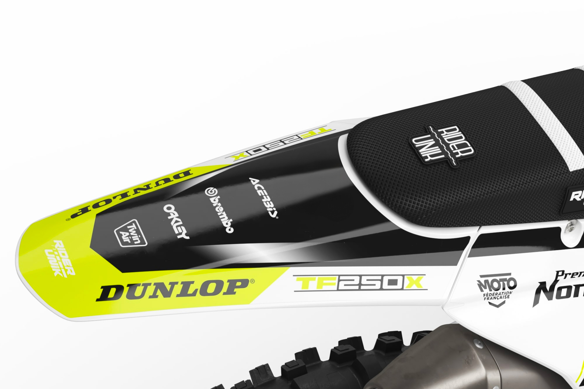 * Kit déco complet motocross Triumph TX F 12 pièces contenant : garde boue avant, garde boue arrière, ouies de radiateur, réservoir (pour les motos concernées), plaques latérales, plaque avant, boîtes à air, protection de fourches et bras oscillant.