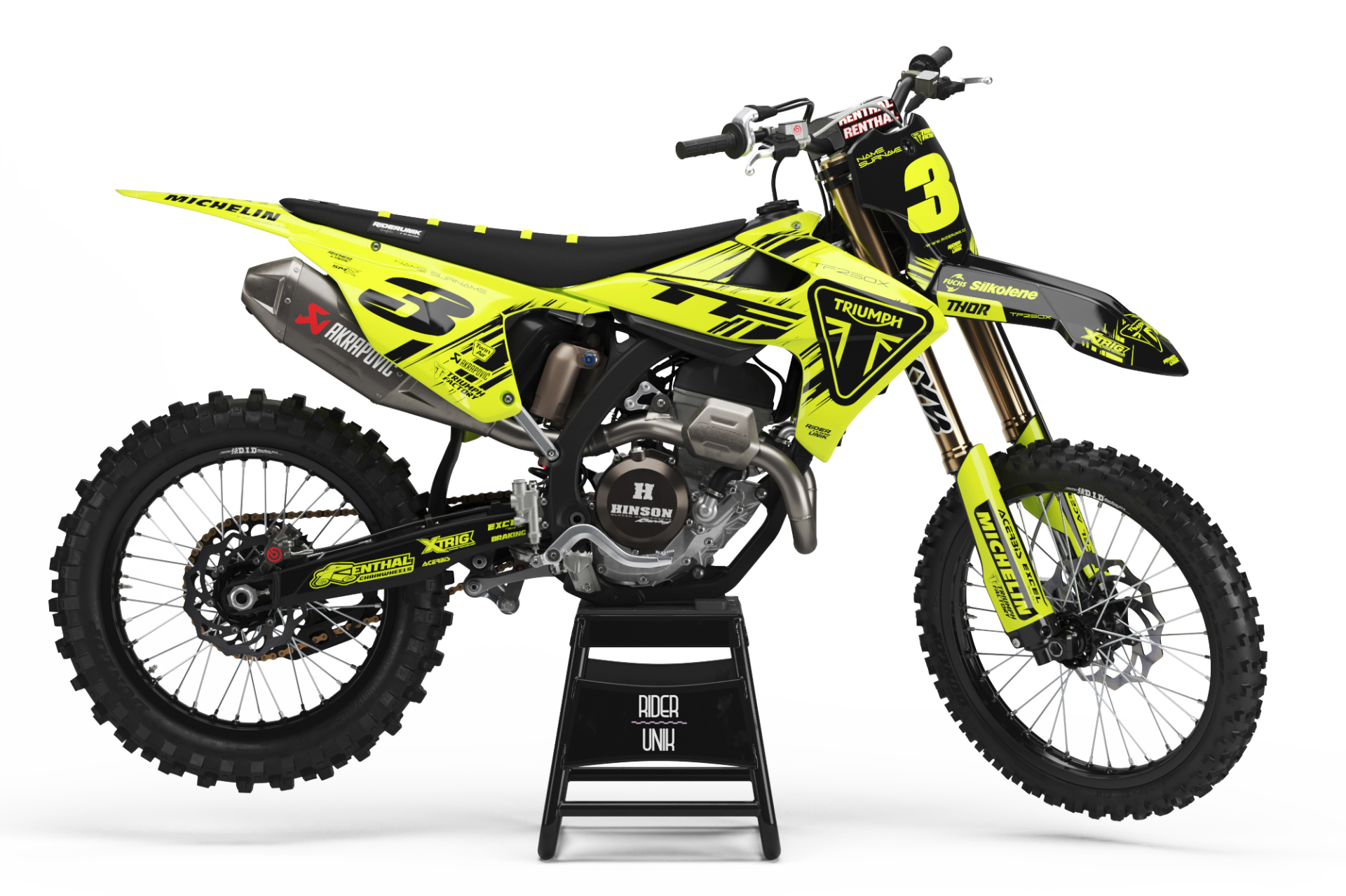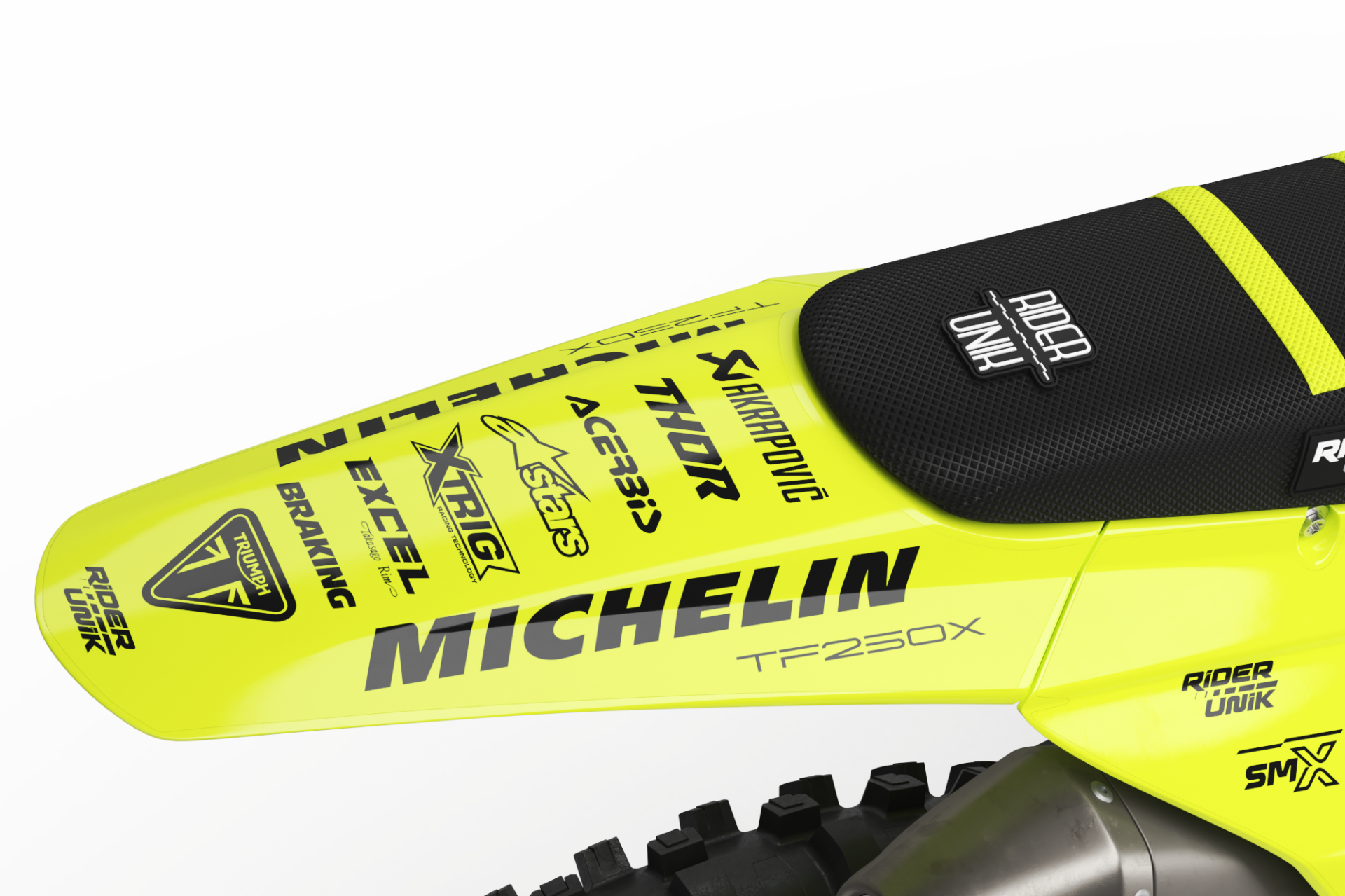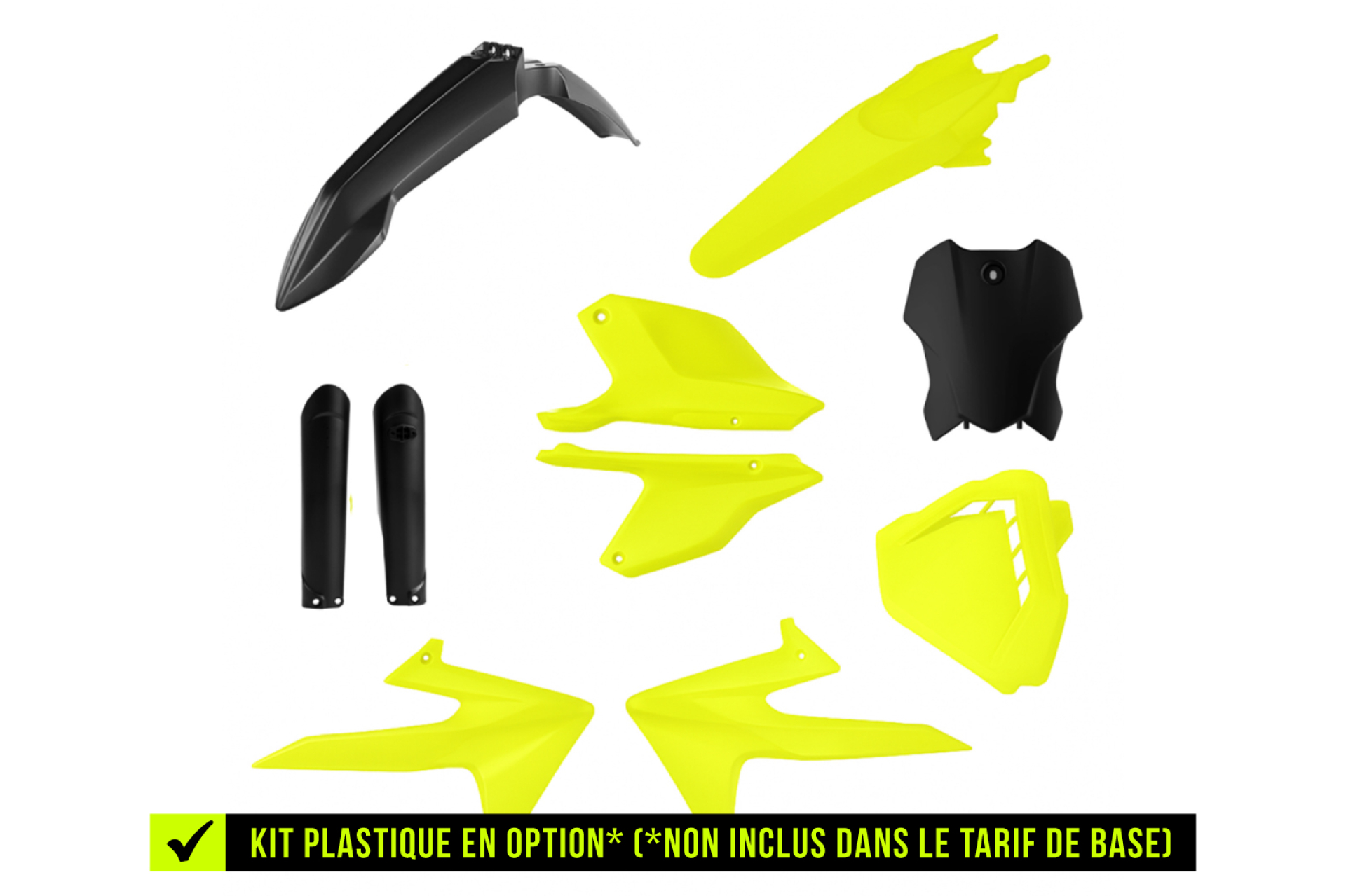 * Kit déco complet motocross Triumph 12 pièces contenant : garde boue avant, garde boue arrière, ouies de radiateur, réservoir (pour les motos concernées), plaques latérales, plaque avant, boîtes à air, protection de fourches et bras oscillant.