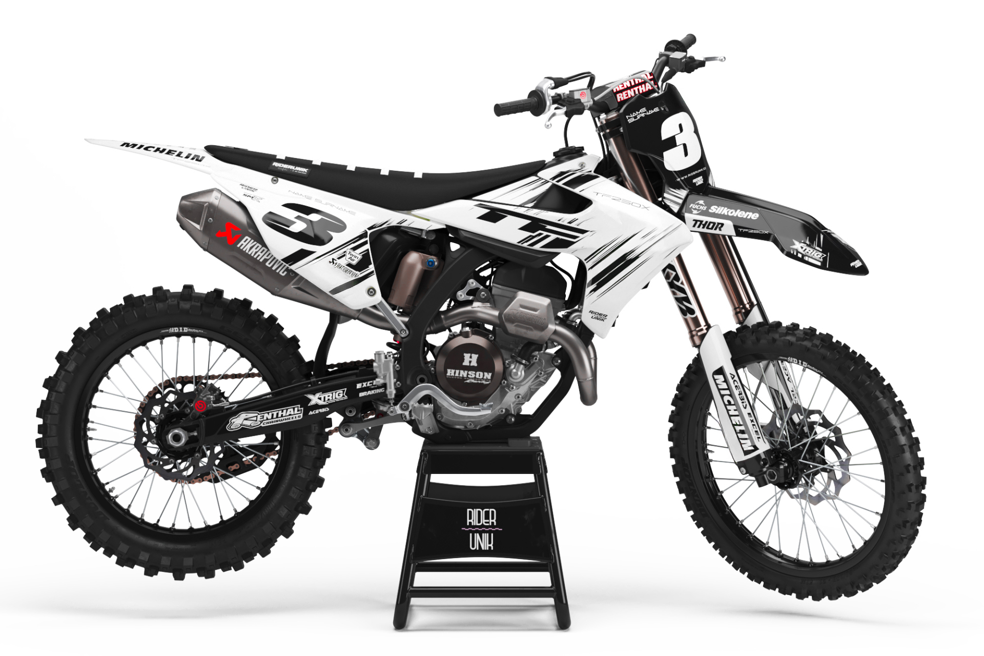 * Kit déco complet motocross Triumph 12 pièces contenant : garde boue avant, garde boue arrière, ouies de radiateur, réservoir (pour les motos concernées), plaques latérales, plaque avant, boîtes à air, protection de fourches et bras oscillant.